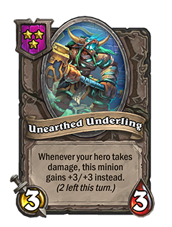 - New: [Tavern Tier 3] 3 Attack, 3 Health. Whenever your hero takes damage, this minion gains +3/+3 instead. (2 left this turn.)