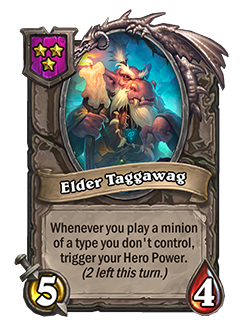 - New: [Tavern Tier 3] 5 Attack, 4 Health. Whenever you play a minion of a type you don’t control, trigger your Hero Power. (2 left this turn.)