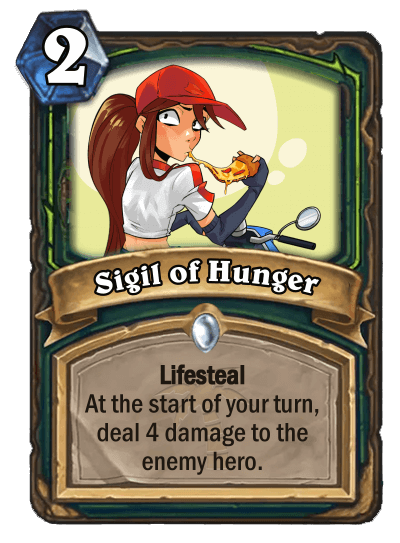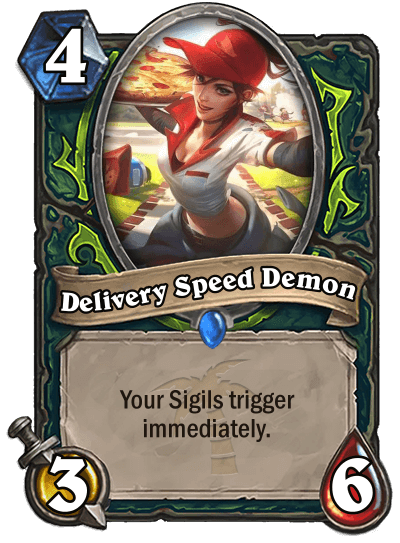 Frostivus: "Demon Hunter inadvertently became the ‘fast food pizza chain class’. Riot Games fan artists had a lot of Delivery Girl Akali pictures for me to use. It was very fun using them for a thematic story across the class cards about a random speed demon."