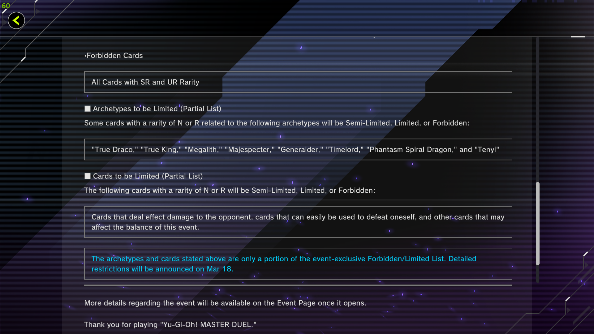 Unlike last time, Konami is giving us a few more details before the event starts, mainly regarding the event's ban list. Archetypes limited from play are True Draco, True King, Megalith, Majespecter, Generaider, Timelord, Phantasm Spiral Dragon, and Tenyi. They will also limit cards that deal effect damage to your opponent, and cards that can be used to more easily lose the game, likely in response to last time's Self-TK decks. Those are just partial restrictions and more details regarding the ban list will be given on the 18th of March.