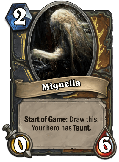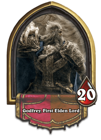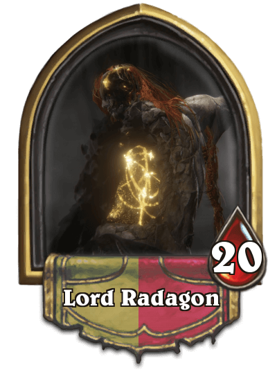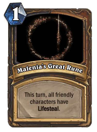 MrRhapsody: "I think the main thought I had when making those heroes was "compare and adapt". Let's take Malenia for example, she's by no mean a druid nor a rogue, she's not stealthy, she doesn't steal anything, she doesn't turn into animals nor throw plant at her opponent's, in fact, she plays her own class in the game, but if you can compare her in game abilities and lore to Hearthstone's you can see why I design her as a Druid/Rogue. Her main weapon is a prosthetic katana, which causes you to bleed, steals your life and is fast as hell! Which Hearthstone class is known for being fast and do a lot of stuff in one turn? Yes, rogue, and another gimmick she is famous for is the Scarlet Rot, a fungal like disease which acts like a poison on one's mind and body, and she reaches the goddess of rot stage, she grows plant wings filled with fungus and butterflies. Fungus, plants, butterflies, which is the best Hearthstone class to represent those aspects, oh right, Druid! So when you see Malenia's class, don't see her as a Rogue/Druid, see her as her own class which can be interpreted as Rogue/Druid. This is another great aspect of Duels heroes, you can mix two classes to create a new one specific to your character, Ranni is not a Mage nor a Warlock, she's a Witch, but can be interpreted as a Mage/Warlock, Radahn is not a Warrior/ Mage, he's a Warrior which occasionally uses magic, but the dual class system allows us to explore the entirely set of a characters' ability without missing flavor. Compare, adapt and make, take notes fellow creators."