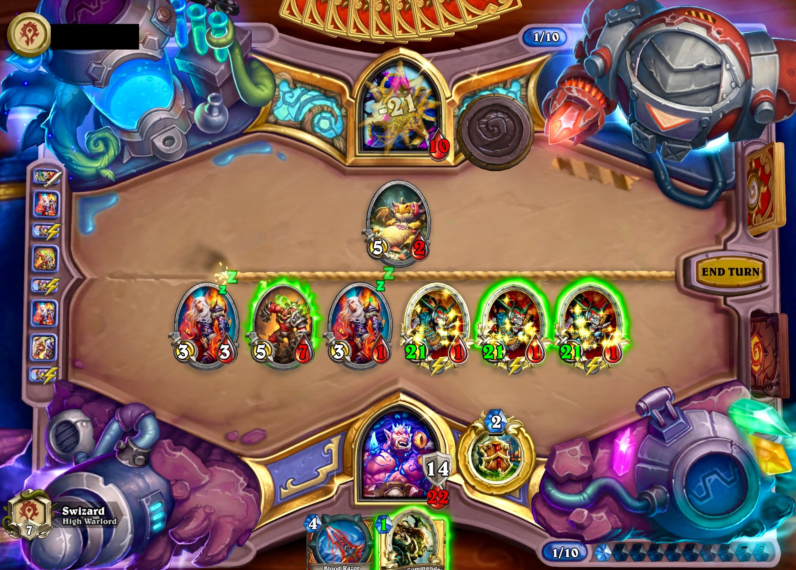 Every minion you play or summon will have Rush due to Warsong Commander. Therefore, you can trade the Bloodsworn Mercenaries themselves in as well as play any other minions you have in hand to do direct damage to the enemy hero. You can even play a patron and keep making more and attacking with them to keep doing more damage. In the end, you can even attack with your E.T.C.s themselves, but save this for last if they are going to be destroyed. It's better to attack low attack minions with them if you can.