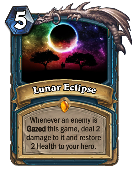 "Gaze actually came quite early in the class's development. It's kind of a protest / exploit against the game's huge amount of RNG. I remember how many times Doomguard discard my important cards or the thing I would give up to roll a Spell Damage totem in order to make my cards a guarantee board clear and know that I have to do something to address these thing for the game. The name Gaze itself was chosen since it demonstrate a "focusing" aspect that go well with what it actually does, as well as representing the astronomy theme of the class."