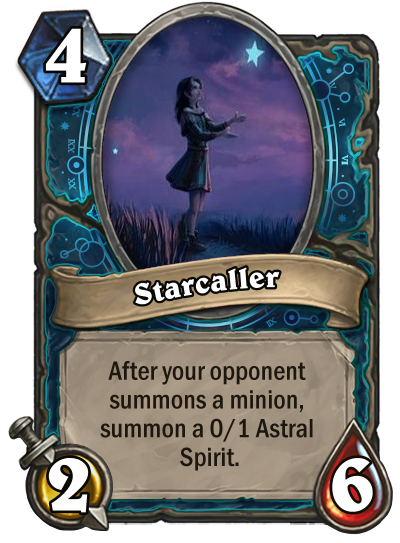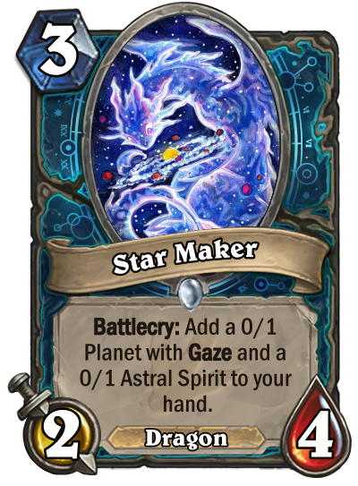 "The initial inspiration for class is when looking through the Mage Boomsday Project cards. They are probably underwhelming compare to the other classes, but the artwork (plus of cards like Star Aligner and Harbinger Celestia) are so beautiful that I've been designing a couple astronomy-related cards. This is only strengthen for the Puzzle Labs artwork. However, during the time I was entering the Class Creation Competition, I was debating whether or not to bring this only really in the infant stage class or another class I have been pouring a lot of effort into it called the Ethereal. I have distinct themes and decks for the Ethereal ready to go while I'm just even building Astromancer from the ground up. And the Ethereal was receiving positive reviews from the Discussion forum too! However, fate force my hand when someone informed me that the Ethereal's keyword is the exact same keyword one of the previous finalist (the Summoner) created. With much difficulty, I have to abandon a class that I've spend so much time creating and finding artwork (because artwork of the Ethereal from WoW is really rare and specific, so I have to spend a lot of time and be more creative with my art) and just submitting what I got so far for the Astromancer. The token playstyle that eventually became integral to the identity of the class didn't even existed yet during the time of the class's creation. During the second phase, I finally solidified my class as a versatile disruptive class and decided to go with a unique token swarming playstyle that offer more utility than offensive power."