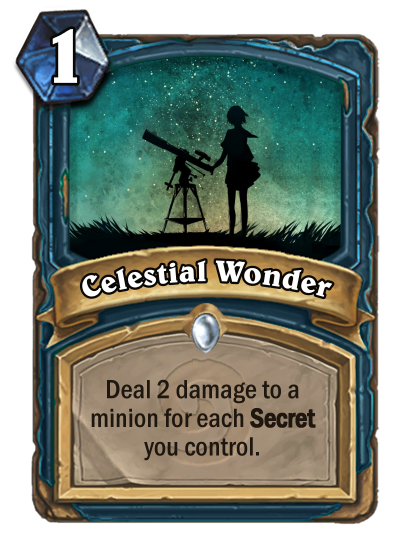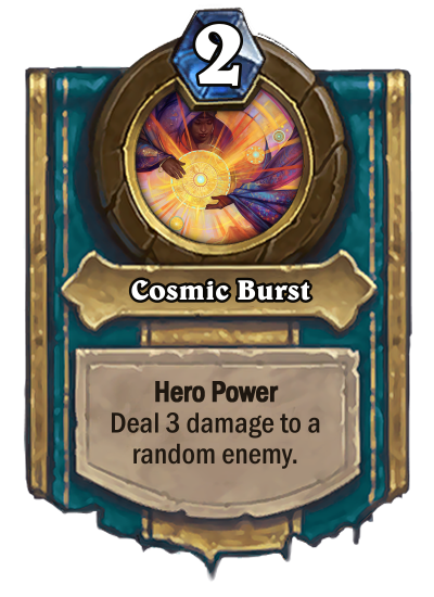 Your basic Hero Power is Celestial Burst which deals 2 damage to a random enemy. When upgraded, it becomes Cosmic Burst which deals 3 damage instead.