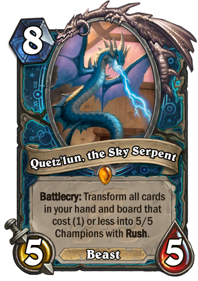 The class is also good at swarming their board with tokens. While lacking in offensive ability, they are more than make up for that with the utility and flexibility they bring to the table. Star Maker is a 2/4 Dragon that allow you the 2 tokens you can play at anytime you find convenient, one with the Gaze utility, one is a healing station for you and your minions. Quetz'lun, the Sky Serpent turn all of those tokens into mighty 5/5 Champions that cost 0 mana and have Rush to remove your opponent's minions.