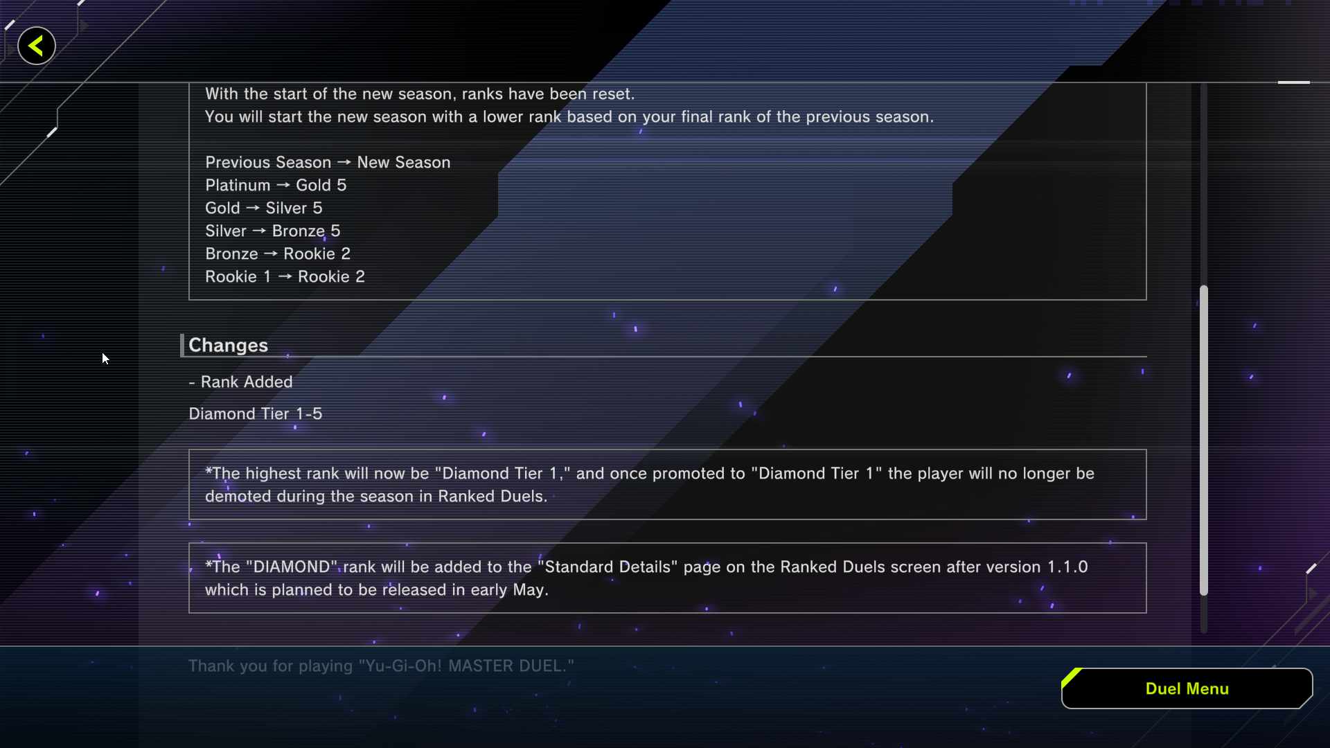 A new season of ranked ladder started in Master Duel, and this one brings a brand new rank with it! Diamond goes right above Platinum, and has 5 tiers, just like the other ranks in the game. Reaching Diamond 5 will grant you 200 Gems, and reaching Diamond 4 through 1 will net you 100 Gems each.