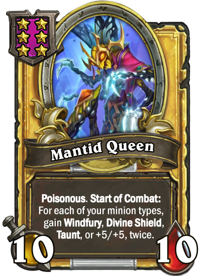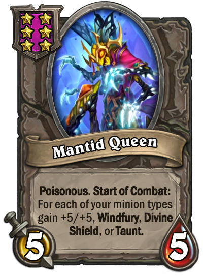 • Don't really care much for Mantid Queen. Even with 6 other minion types, there will always be a chance you don't roll a divine shield, and you're taking that risk every turn.