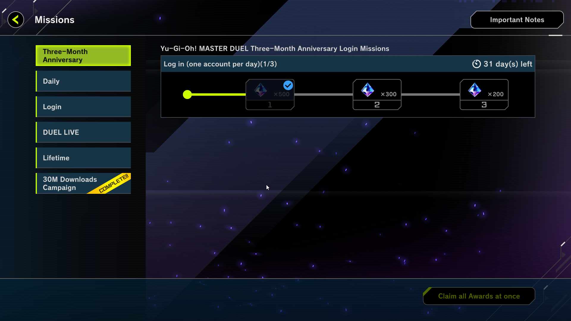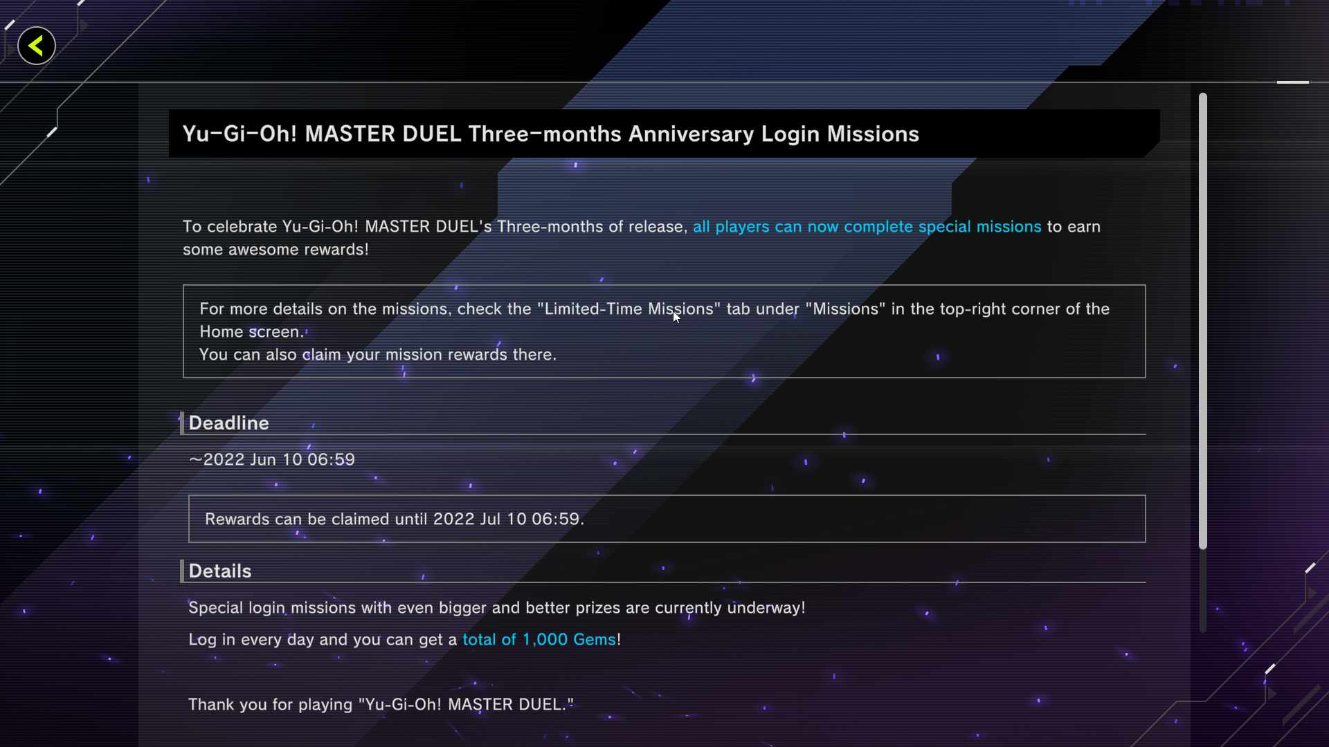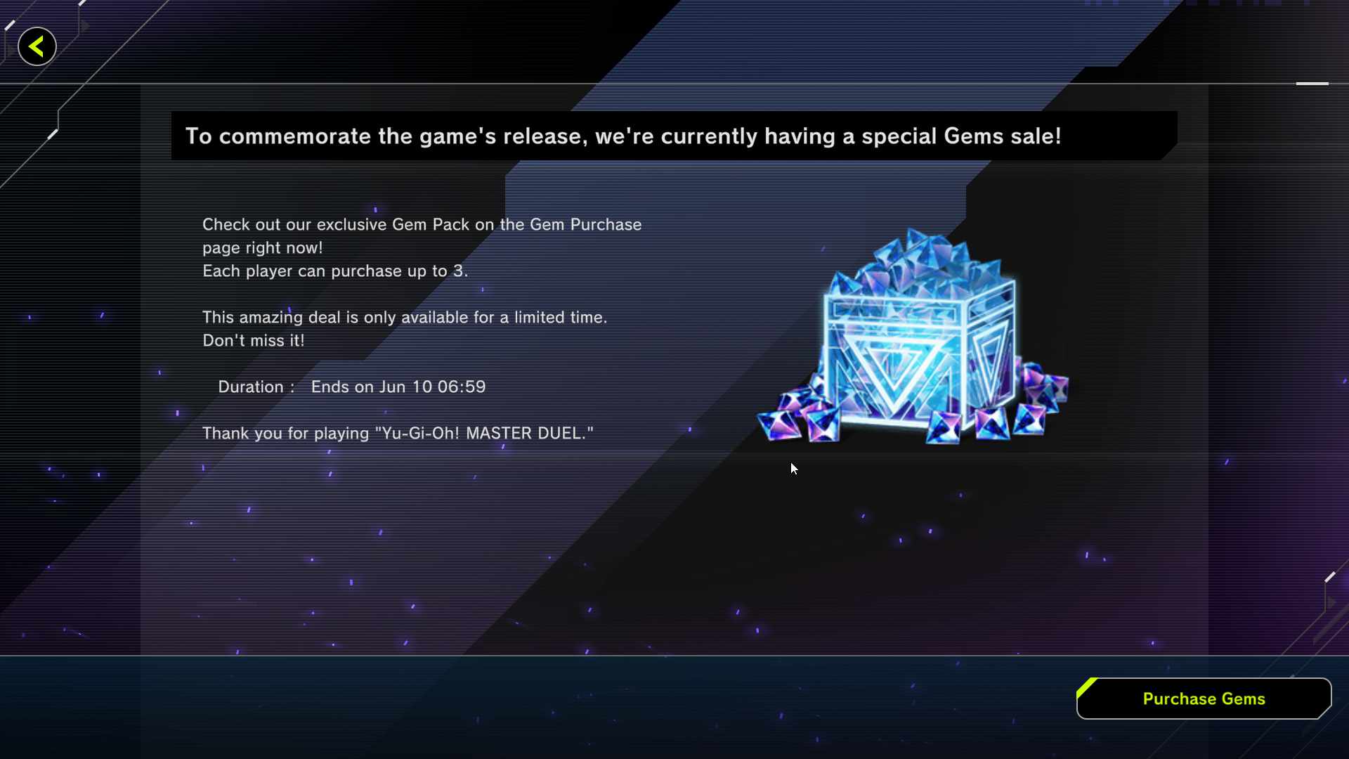 Master Duel has been out for a little over 3 months at this point, and to celebrate the occasion, as they've done a few times in the past, Konami is offering everyone 1000 Gems to celebrate the occasion. However, unlike previous 1000 Gems rewards, they are spread out across 3 login days. Thankfully for the more casual player, you have until June to get them all which gives you 3 weeks to login 3 different times.