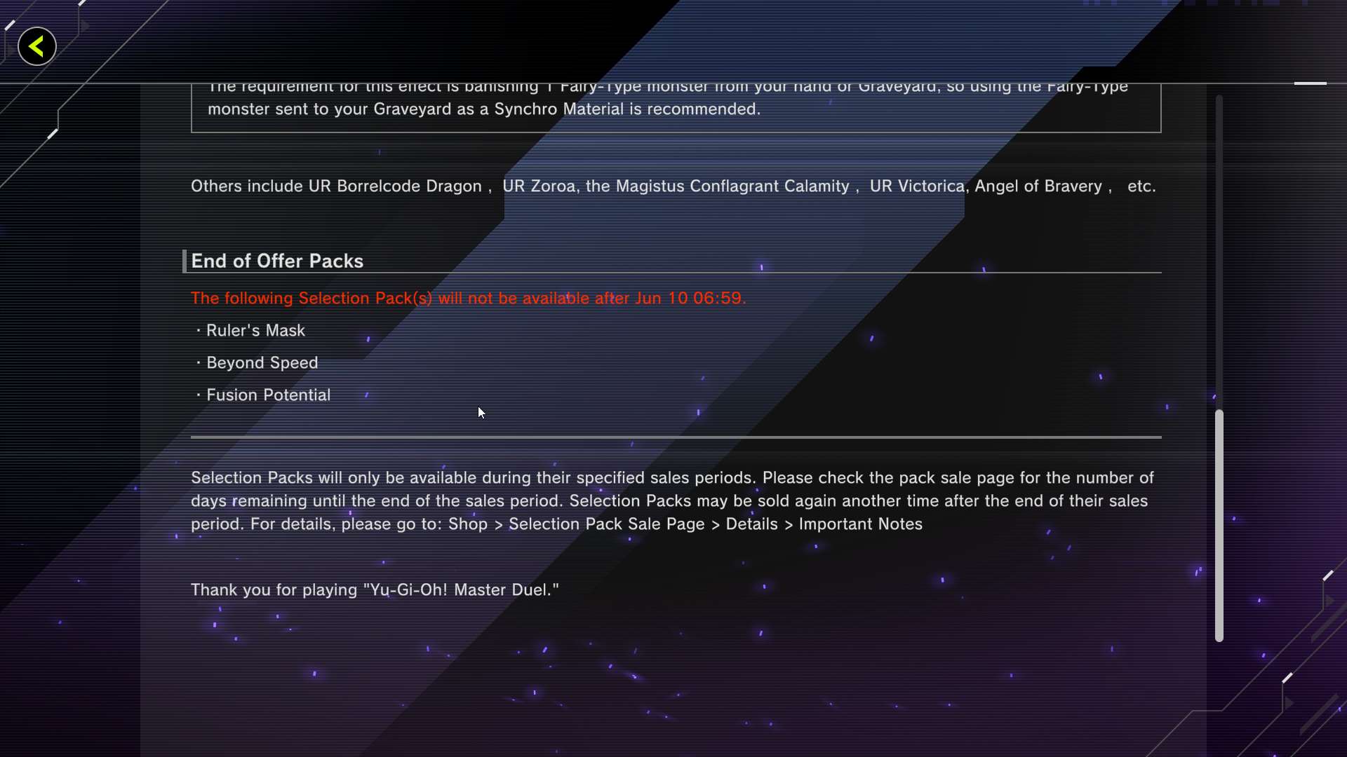 With the introduction of a new pack comes the removal of older ones. Ruler's Mask, Beyond Speed and Fusion Potential will all be removed once Valiant Wings comes to the shop. The first two were added to the game a couple of months ago, while the latter was added about a month ago and is quite surprising to see it leave so soon. If you're planning on getting cards from either of these packs, now's your last chance!