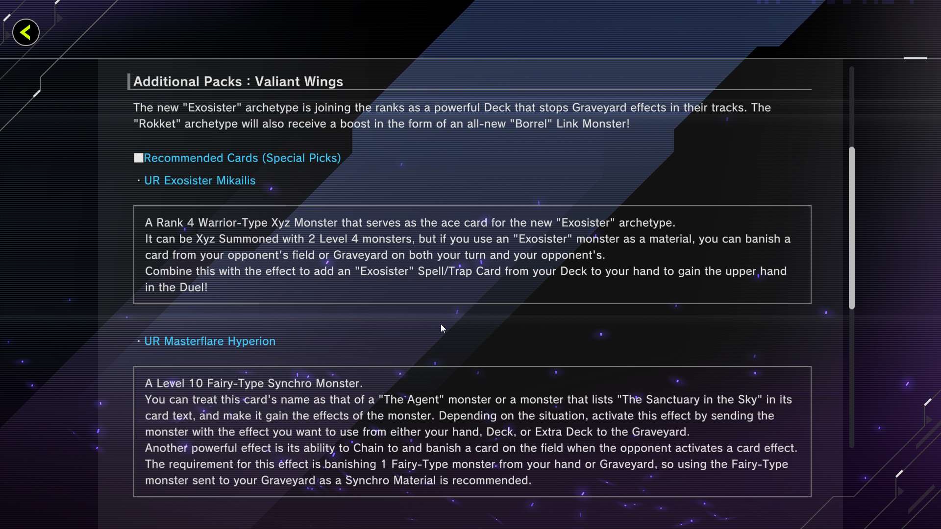 A new Selection Pack will be added to Master Duel in a few days. This pack, named Valiant Wings, will bring the Exosister archetype to the game, as well as a number of other powerful cards, including support for the Rokket archetype in the form of Borrelcode Dragon. So far, we know the following cards will be added (all UR):