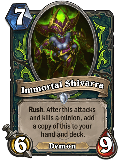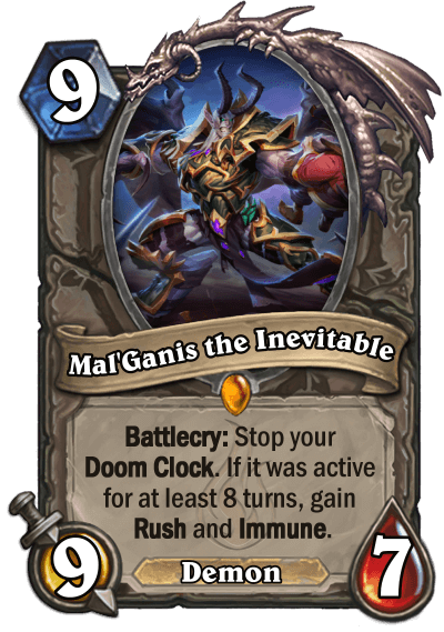 Mal'Ganis the Inevitable: Unless you have been able to set up some form of card testing environment to feel out how Doom Clock plays out in fairly representative games, the Immune part of this card's effect seems far too strong and accessible to be balanced for the game. The Immune keyword in Hearthstone has always been either temporary or in some way interactable with. In the case of the currently existing Mal'Ganis in Hearthstone, he only provides your Hero Immune while he is alive on the board. If your opponent can kill him off, they can then start interacting with your Hero again. As it stands with this card's current design, if you get him down on the board with the Battlecry trigger, you'll have a permanent 9/7 on board for the rest of the game. NOTHING would be able to destroy or interact with it. I tried to come up with an alternative design or keyword to take the place of Immune but honestly it would change the card too much if you are trying to keep its design a callback to the old Mal'Ganis. This is also why I believe the Hearthstone devs themselves have not created a retrain of Mal'Ganis yet, because whatever they would design for a new version of him would have to be something completely new or different than what his existing version does and is themed around (Demons and Hero Immunity).