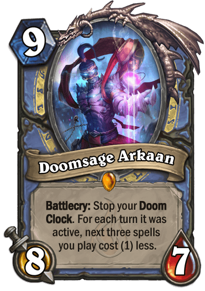 Doomsage Arkaan: Overall the majority of the Bringer legendaries' effects are worded in ways that are clear and understandable enough to make sense to the average player. However this card's effect is the exception and actually made me do a double take on it since the wording didn't make total sense to me when you described the card as super powerful/impactful. It made me realize that these Bringer legendaries would really benefit if they utilized the "(Upgrades when X.)" wording instead of a frontloaded effect. Here is my rewording of the effect that retains the same outcome/goal and makes it more clear and understandable: "Battlecry: Stop your Doom Clock. The next three spells you cast cost (1) less. (Upgrades each active Doom Clock turn.)".