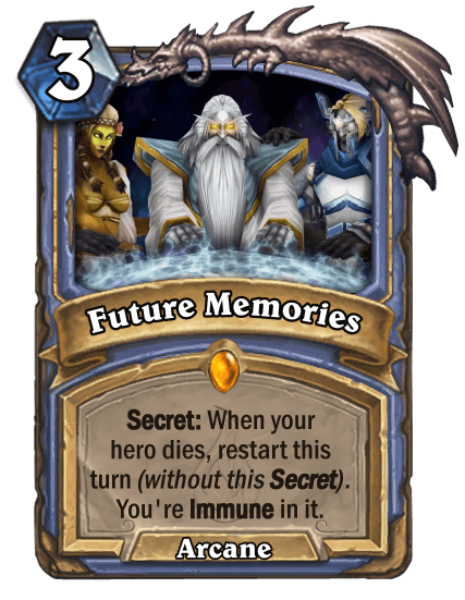 Future Memories: Currently this card's effect is incredibly confusing and unclear to the average player, as well as not accounting for / being worded correctly to make sense on both the player's turn and the opponent's turn. A more clear and understandable version of this effect, which retains the same outcome/goal of the card and can still be formatted well should read, "Secret: When your hero takes fatal damage, prevent it, become Immune, and restart that turn (Without this Secret)."