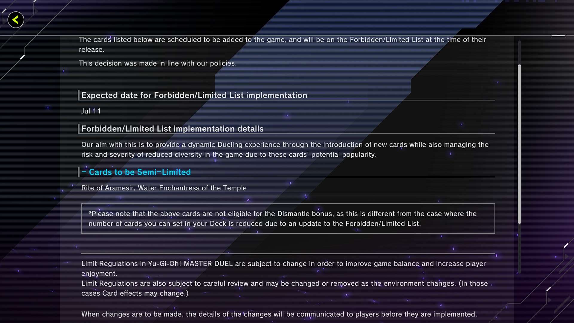 Two of the cards to be added, Rite of Aramesir and Water Enchantress of the Temple, will come to the game Semi-limited. Both of these cards are Limited in the OCG, but completely Unlimited in the TCG. Seeing as Master Duel somewhat follows the former's ban list, this is likely just Konami being cautious, but not wanting to completely stop the new cards from seeing play. There's no other changes to the list.