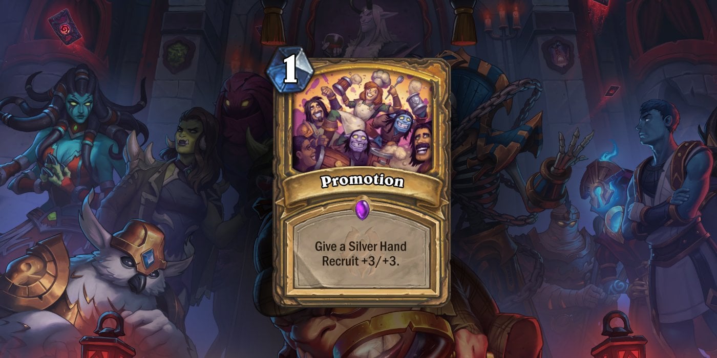 I'm betting the mana cost makes this card early-meta aggro bait, but that it ends up getting revisited halfway between patches in slower lists. Tbh it really looked like trash to me at first, but then I thought of Blessing of Kings and how that's had use cases as both a finisher and a means of value trading. I don't think Promotion gets run outside a Dude Pally deck, but I do think in a more ecalue-oriented version of that deck it gets better the longer the game goes on--+3/+3 in the early game does nothing against the current interactions of more controlly Warrior/Paladin/Priest/Warlock decks, and decks like Fel DH and Rogue would likely just ignore an early 4/4 and kill your face (or kill it while still killing your face using cards like Fel Barrage or Multi-Strike). In the late game, though, you've got a potential 30-damage Silver Hand combo costing as little as 6 mana if the opponent leaves up a single Stewart the Steward recruit and you've a Great Hall charge ready to go (Great Hall + quest aura + Stewart buff + 2x Promotion + 2x The Garden's Grace + 2x Conviction (Rank 1) = base 3/3 + 2/2 + 3/3 + 2 x 3/3 + 2 x 5/5 + 2 x 3/0 = one 30/24 Silver Hand Recruit). (More as a general remark on Dude Pally, I also see potential shenanigans to be had post-Cariel with Red Herring + a super-buffed Silver Hand Recruit.) It's also not bad in allowing a 1/1 recruit to value-trade almost any early-game minion. Idk if it's quite good enough to run in a Control Pally list, but I do think it has enough mid-/late-game utility that it merits consideration.