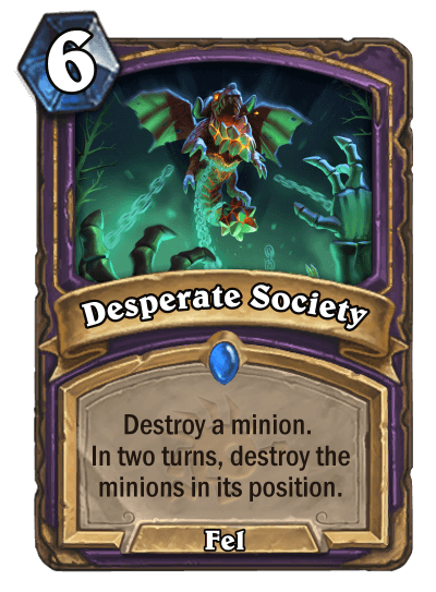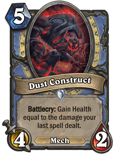 Both Desperate Society and Dust Construct are spiritually kept, former I still liked, but they found it too weak (even with the potential of destroying 3 minions) so I changed it to be a "minion", instead of a spot on the board. Dust Construct would've been the first card if not for Shaman, and I still like that the effect is out of place for mage, but it was way too weak, so it became a 3/3/2, its still powerful, and with AoE present in mage, it can easily go for +20 Health."