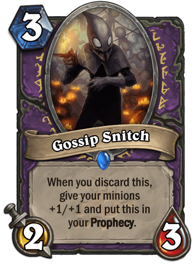 All of these cards didn't end up making the cut, Gossip Snitch was made early on when I had discard as an archetype for warlock, but upon the change of it, ended up getting the hammer. Energizer was way too weak and weird, didn't really end up feeling Rogue-ey, good news it, ended up being changed for Black Market (they did have a drugs/trafficking theme going on).