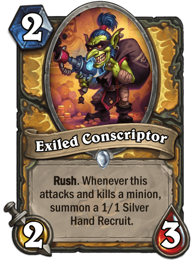 I did want to mention Exiled Conscriptor, considering the military and protection themes that they had in the base expansion, this goblin was associated to them in the recruiting department, however his methods of gathering new recruits was so unethical, that he was stripped off his position and exiled from the town, and thus, found his place here.