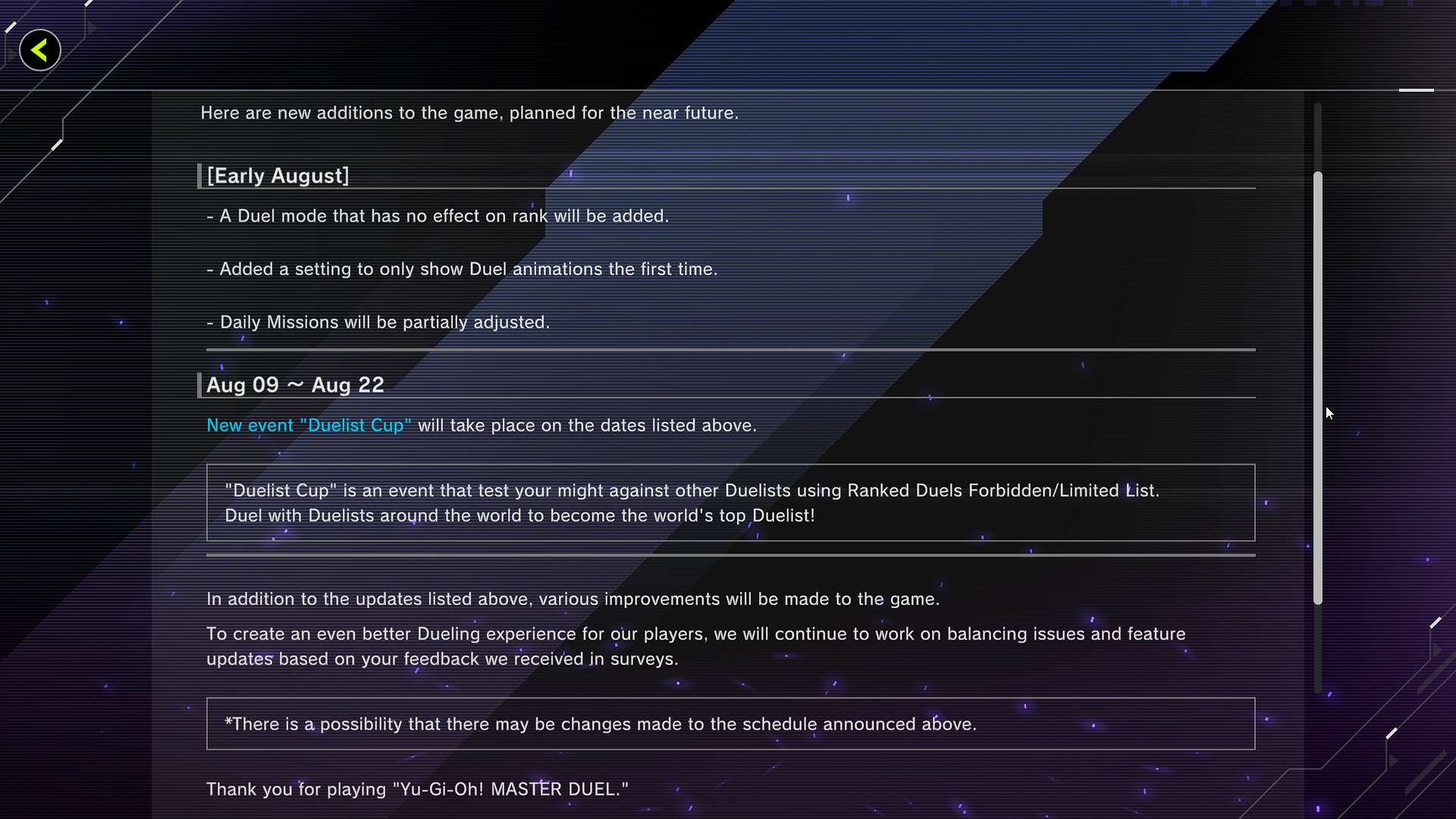 Also in August, between the 9th and the 22nd, there will be a Duelist Cup event. No further details were provided, except that it will use the same rules are regular Ranked duel. Our best guess is that it's some sort of tournament.