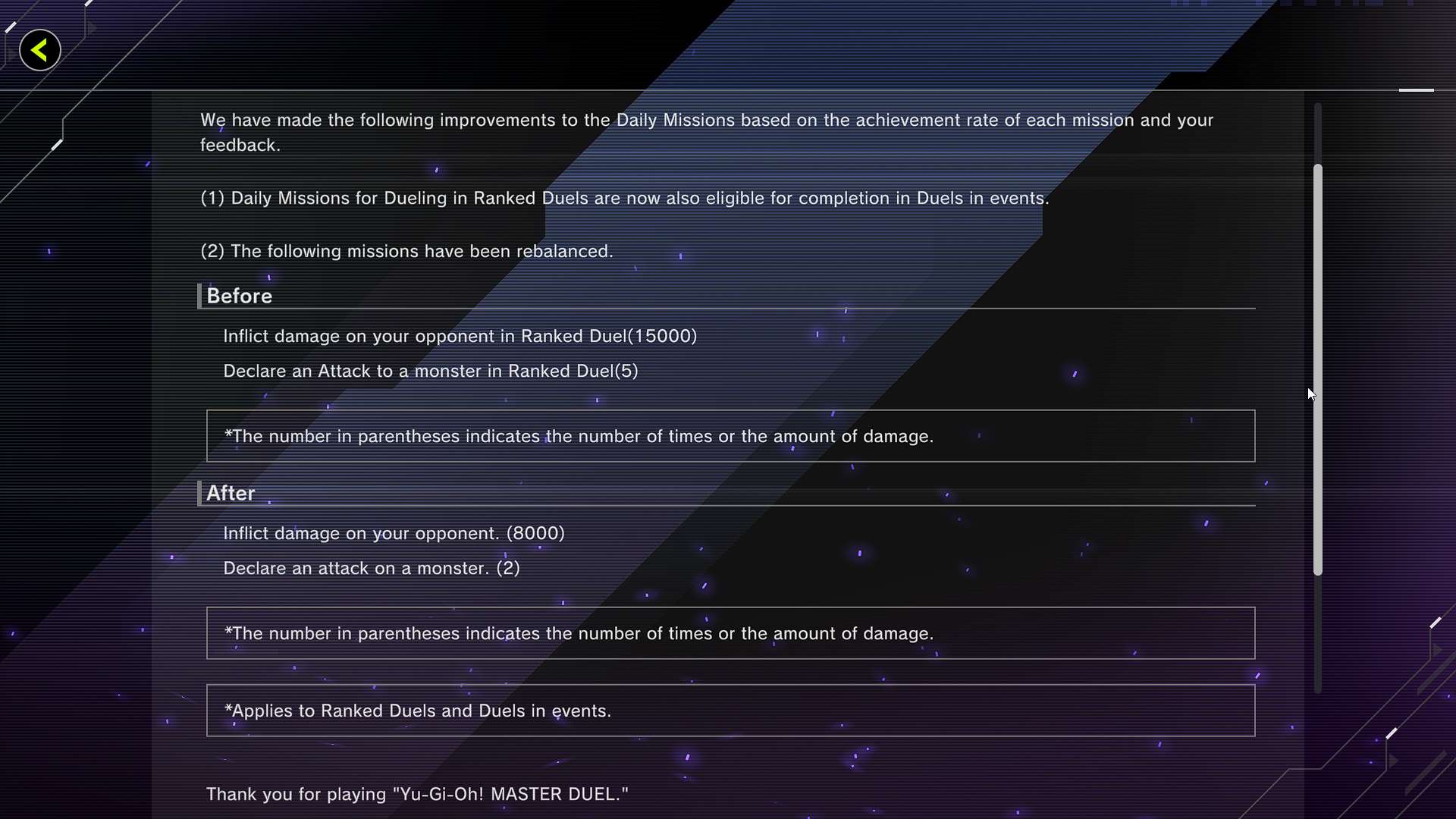 Good news for all Master Duel players! As mentioned in a news post a few days ago, there are some changes coming to Daily Missions, and they're all for the better. To start with, all Daily Missions can now be completed during events. Do note that they've implemented this right after the EX-Zero festival ended, so there's a chance future events will have smaller Gem rewards in dedicated missions.