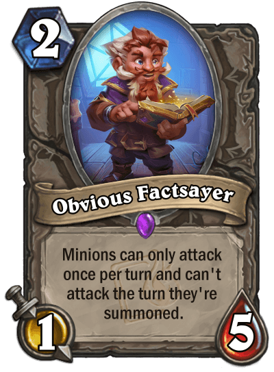 Obvious Factsayer - This mini-set's only Epic. And it's really quite Epic, not gonna lie. Those Rush, Charge, Windfury and other multi-attacks can be really uninteractive to play against. Factsayer buys you a lot of time to prepare for that.