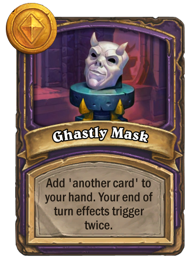 When Ghastly Mask is offered as a reward, "another card" on the text of it will be replaced by a minion with an end of turn effect. Not all minions with an end of turn effect can be generated by it.