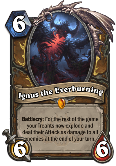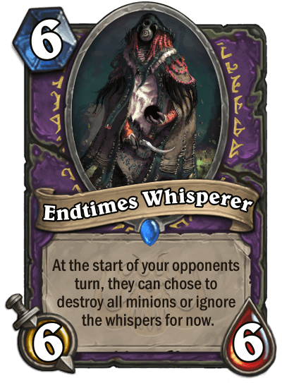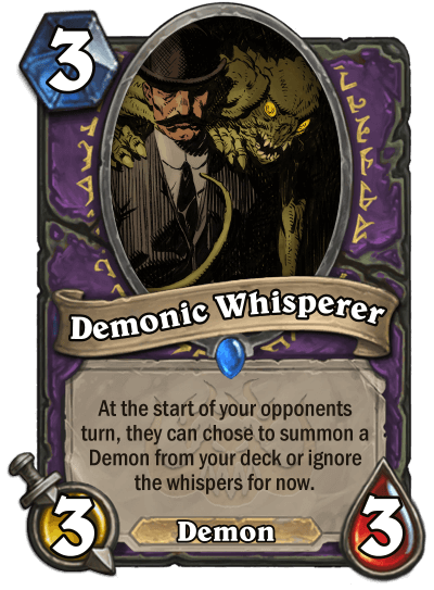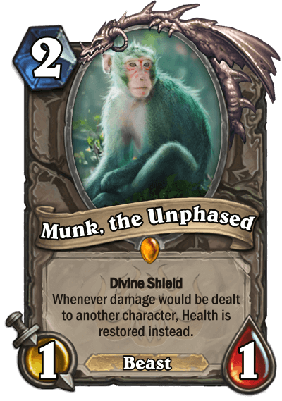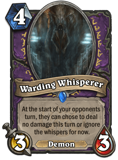 MenacingBagel: "I personally want to show case three other cards well one is a group but you get it. The first of which are the whisperers. I have no idea why I gave warlock a whole mini mechanic which is basically just ask your opponent to do thing and they can pick to do thing or do thing later but they have to do thing. The second card is the most annoying to balance which is Ignus the Everburning the guy had like 4 reworks before I settled on kamikaze trees. He had several iterations which were just unfun or too powerful which is funny considering Elica is a card. And the third is my personal favorite of Munk the Unphased. I like control cards and I like funny cards so a monkey not caring about the horrors of war and just relaxing is nice to me. Plus if this expansion were real I’d probably actually craft Munk for his hard taunt effect"
