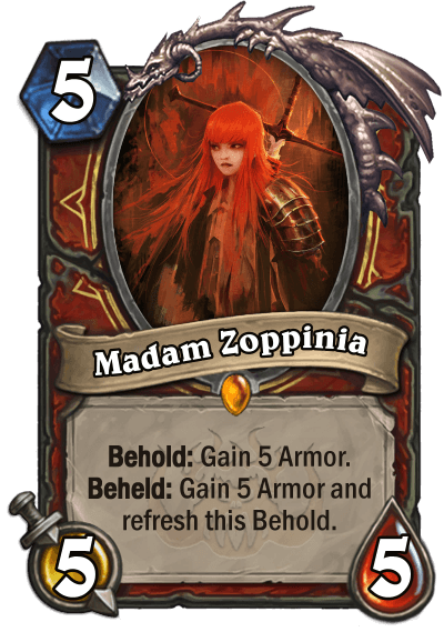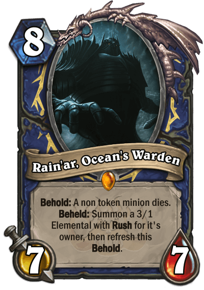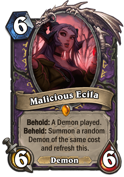 Behold stemmed from me really wanting something WILD something CRAZY in my expansion. And I figured what better way to just go absolutely nuts then to have effects for cards that don’t have to be in play to activate. Behold kinda works weirdly throughout the expansion with some cards just gaining keywords or battlecries while others are instant effects. Rain’ar gives your opponent crabs as well for balance whereas Ecila just doubles your demons with no repercussion which is a huge design oversight."