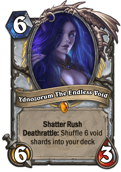 MenacingBagel: "Shatter is really easy to answer. I make pretty unbalanced card effects. And so I thought how to balance those out? Why it was simple make it so you had to play the game out to even use them. Like C’thun the shattered most of the Shatter minions have a very strong effect while others are a little less powerful hence why they have lower piece counts. My personal favorite of all Shatter cards is Nekron The Lord. I don’t play Deathrattle DH but I think she would be a very fun addition, granted her 3 mana discover a deathrattle minion with no other effect piece is clunky, but think of the swing turn!