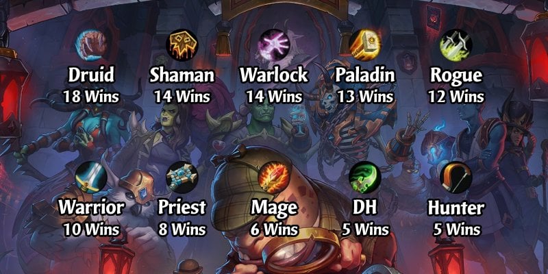 Demon Hunter and Mage are the only two classes without any winning cards in this season. On the other side of spectrum is Druid, Priest, Shaman, and Warlock all tied for the most with 4.