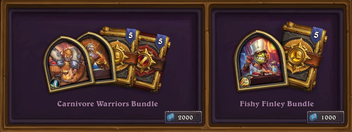 Carnivore Warriors Bundle has similar contents for Paladin (Uther) and Warrior (Garrosh), minus the card back. Therefore the bundle is a bit cheaper, priced at 2000 Runestones ($19.99). The second bundle from last week, Fishy Finley, has a new Finley skin for the righteous class, as well as 5 Paladin packs. The price, as could be expected, is half of that of the bundle above, 1000 Runestones ($9.99).