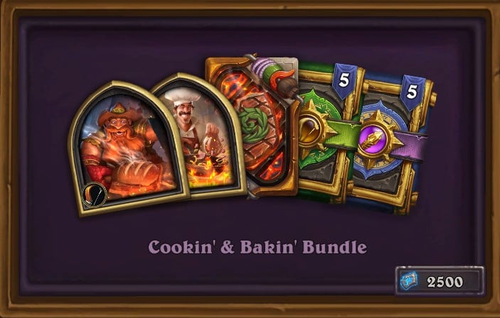 The cooking-related skin bundles continued with yet another two new ones hitting the shop. The oldest of the bundles, Cookin' & Bakin' Bundle, still remains. It contains hero skins for Hunter (Brann) and Mage (Reno), as well as 5 Class packs for each aforementioned class, and a special card back. The whole thing comes with a price tag of 2500 Runestones ($24.98).
