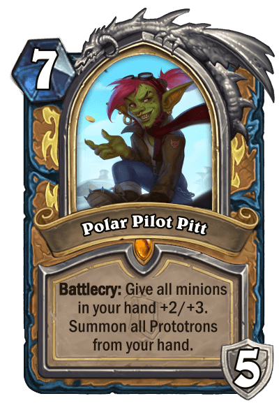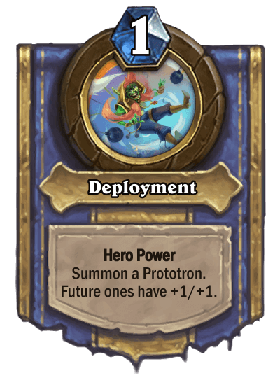 Your basic Hero Power is Minor Production, which adds a 2/2 Prototron to your hand that costs 2 mana. Upgraded, it becomes Major Production which adds two Prototrons to your hand instead. Prototrons have a similar role to Silver Hand Recruits in Paladin in that there are a number of cards in the class that are specifically synergistic with these Prototrons.