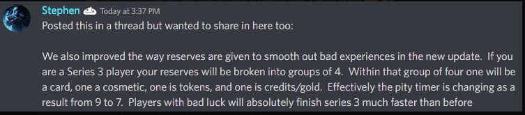 That's about it for the shop, but we also have some improvements regarding the way Collector's Reserves are being handled. For Series 3 players, Reserves are now split into groups of 4, where one will be a card, one a cosmetic, one with tokens, and one with gold/credits. This should reduce the existing pity timer from 9 to 7.