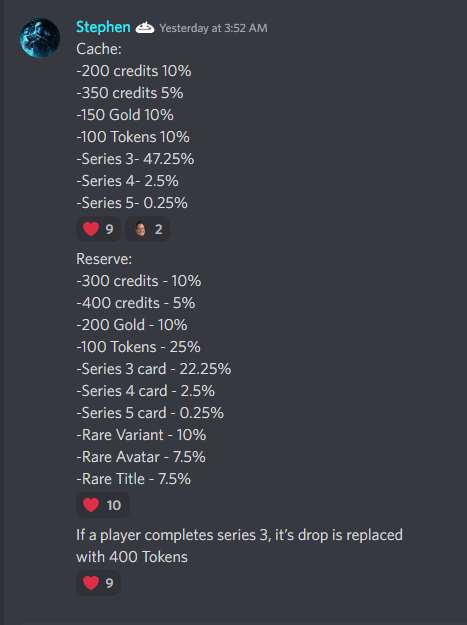 We also have the exact odds of getting a card in a Cache/Reserve (the linked Guide will be updated once the patch goes live). The overall odds for getting a card don't change (50% Caches, 25% Reserves), but you have a 2.5% chance at a Series 4 and a 0.25% at a series 5 for both of them. Once you've collected all Series 3 cards, their drops will be replaced by 400 Tokens.