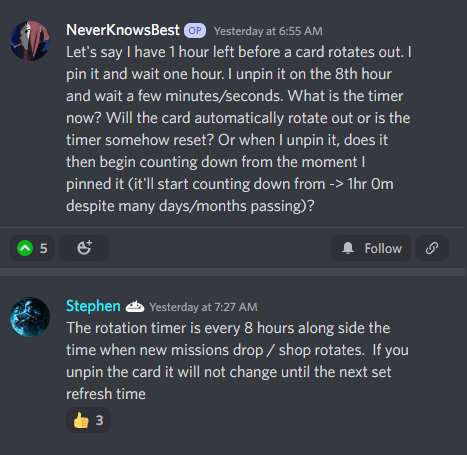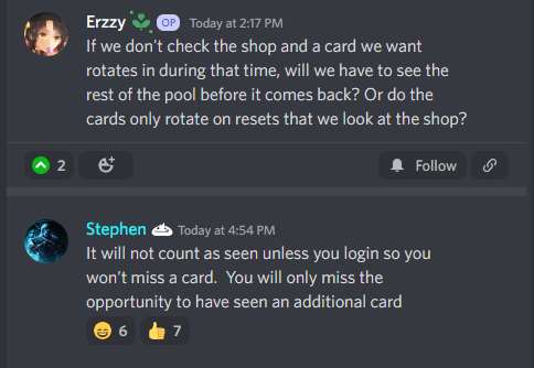 First up, let's talk about the card rotation. As mentioned, you'll be offered a random card to purchase, but the rotation itself isn't 100% random. If you see a card and don't get it, you won't see it again until the shop went through all the unowned cards from that series. Also, a card doesn't count as "seen" unless you've logged in, so a card appearing in the shop while you were away will come back soon enough. If you unpin a card, it'll rotate when everything else refreshes (like daily missions).