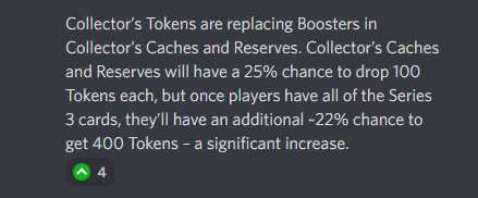 How do you earn Tokens? You'll have a 25% chance of getting 100 Tokens from Collector's Caches/Reserves, and they're replacing Boosters. Something we missed is that, once you have all Series 3 cards, you'll have a chance to get 400 Tokens (more details in the following section), which should speed up your acquisition of cards.