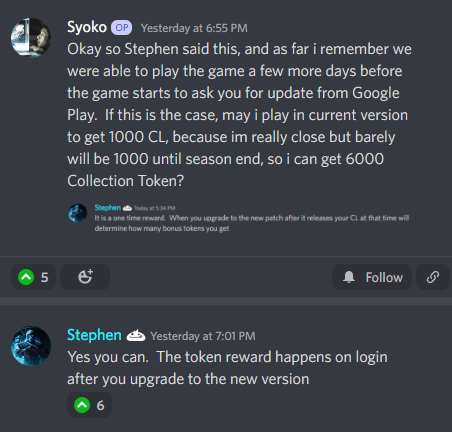 As we've already pointed out above, you could always delay the patching process by disabling auto-updates (either on Steam or on your mobile storefront page for the game), and then earn an extra few days to work on advancing your CL - as long as you think you can get there. Eventually, the client will force you to update to the latest version if you wish to continue playing; so it's not possible to escape your fate for long. The collector token bonus happens on the first login once the patch has been applied. That's been all confirmed by the developers.