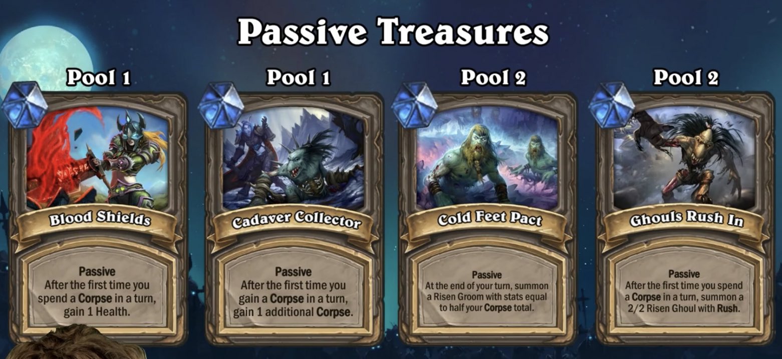 Two Death Knights is a curious number, anyway, considering we are going to have three Rune types at our disposal: Frost, Unholy, and Blood. The Corpses mechanic is also very much present and woven into several of the new Hero Powers and Signature Treasures.