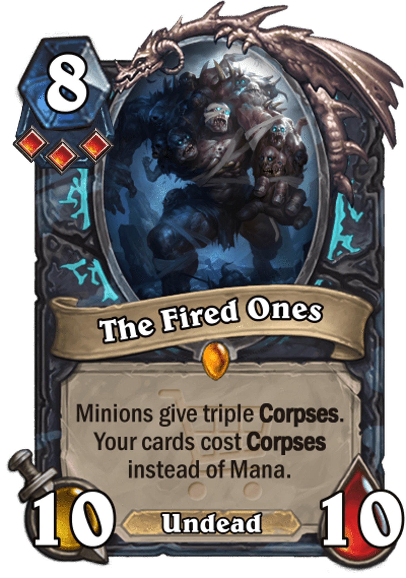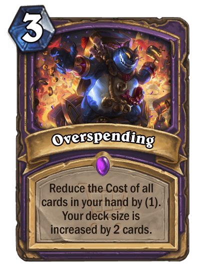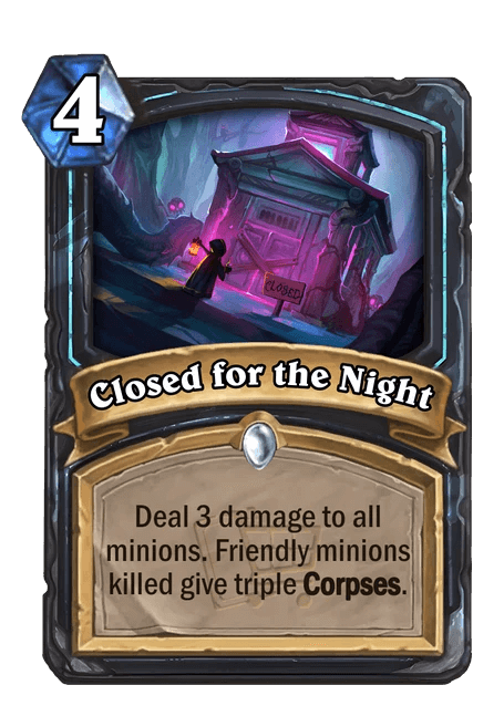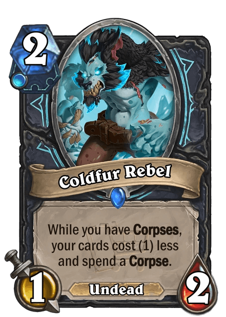 TheFriendlyEnemy: "Death Knight’s sudden appearance midway through designing the set posed an interesting challenge. With only one expansion worth of cards to reference, there aren’t a lot of themes to work with for a whole Standard year. Luckily, the Corpse theme happened to line up perfectly with the Gallywix Megastores theme of spending resources that aren’t Mana, leading to some fun designs like The Fired Ones and Stitched Shopper."
