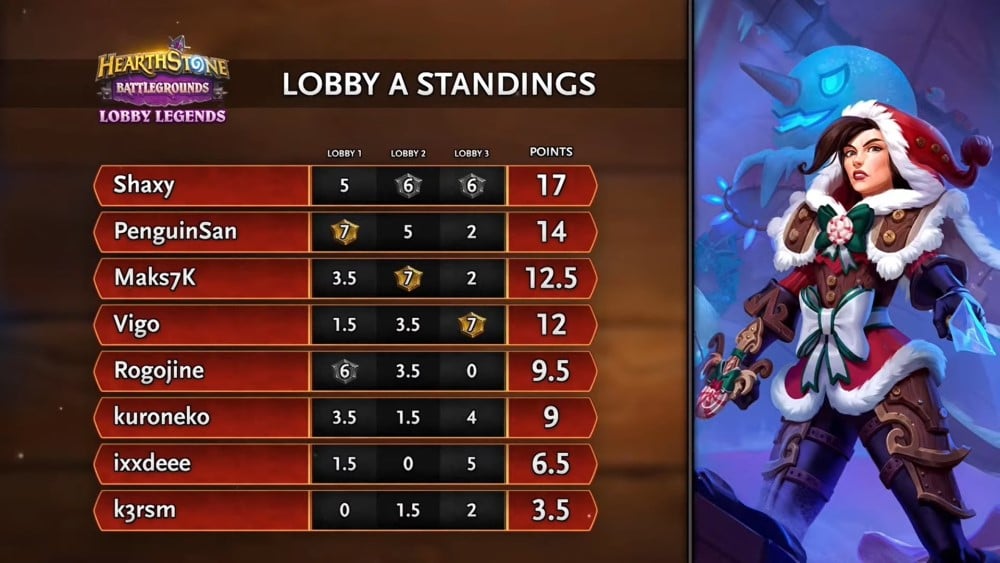 Hearthstone Battlegrounds tournament series Lobby Legends continued this weekend with the ninth event called "Winter Veil". 16 qualified players around the world fought for the glory and their share of the $100,000 prize pool. You can relive the action with our spoiler-free post below.