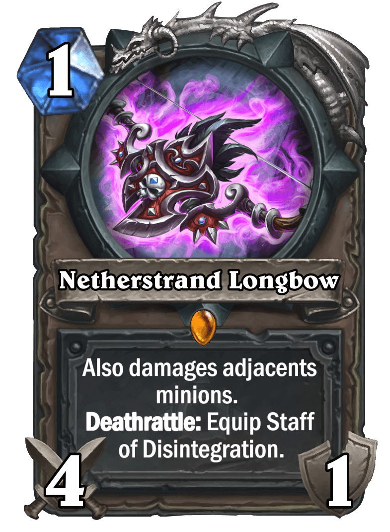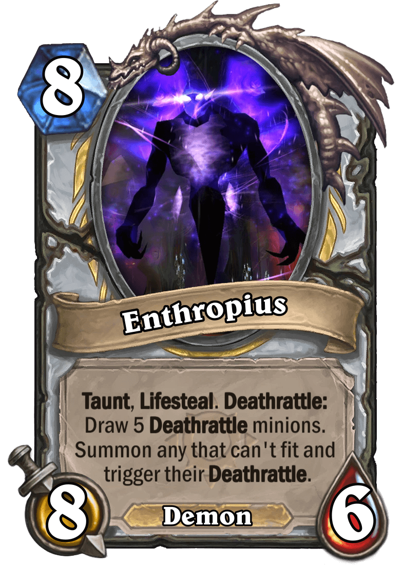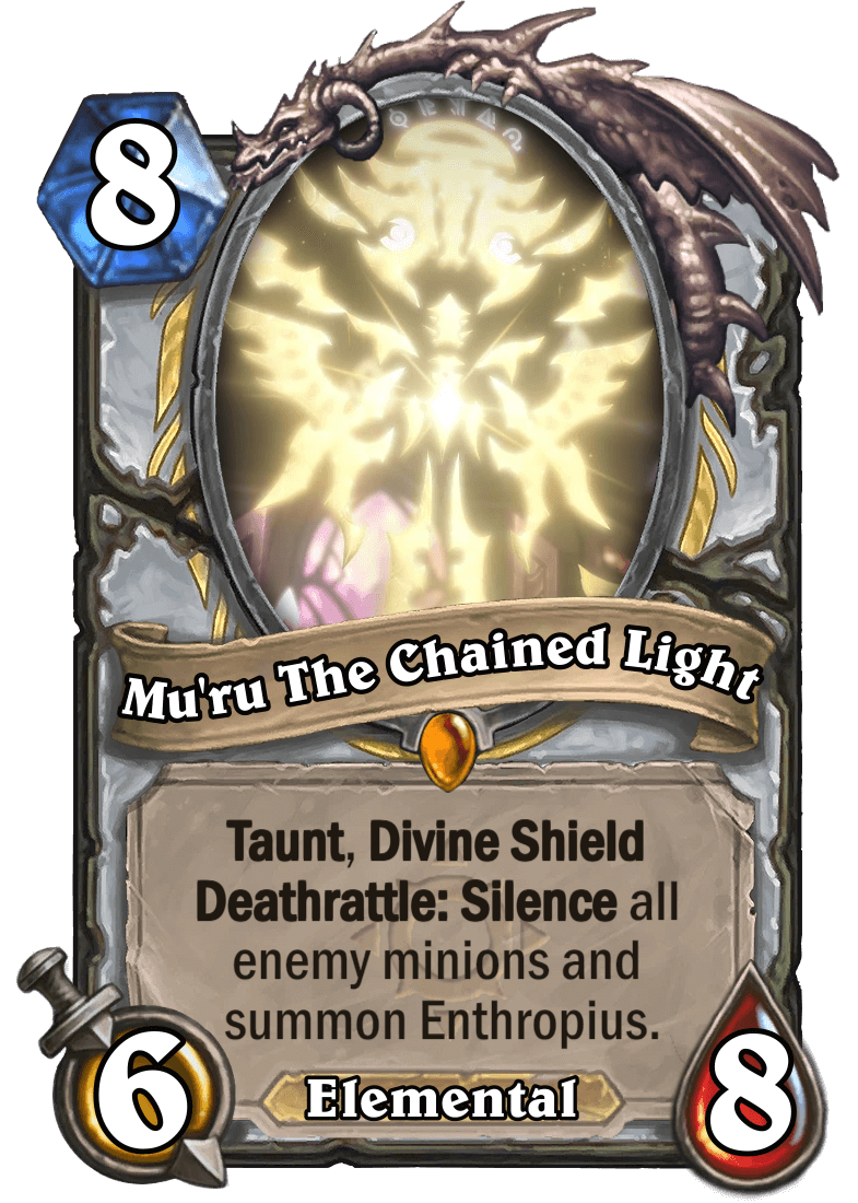 -Mu'ru the Chained Light and its counterpart Enthropius were interesting to design. I wanted to keep that dual feeling I had with the Shard but actually make this legendary lean towards the other subtheme for Priest which was Deathrattles. The symmetric effect and stats, I tried and think of everything to make this card tell a story.