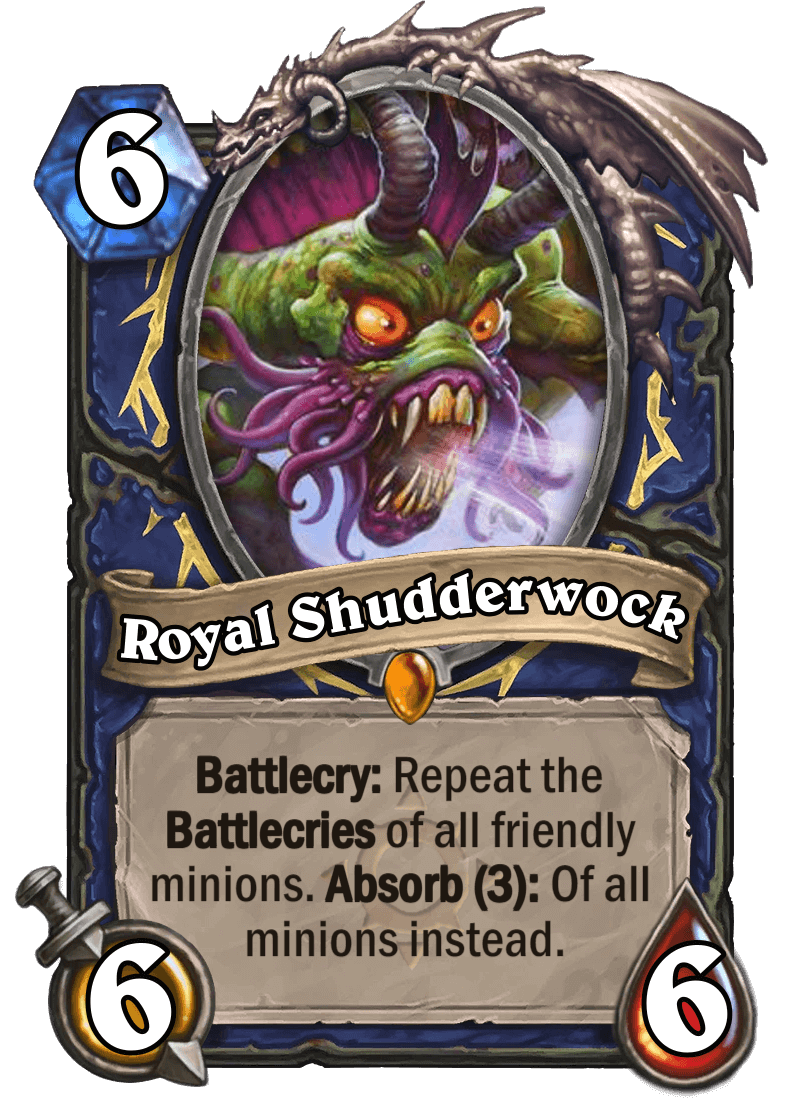 -Royal Shudderwock is in the same spirit as Kalecgos, you can even see the similarities on the cost and Absorb effects. A twist on the old Shudderwock effect where you can replay opponent's battlecries as well as your own on board!