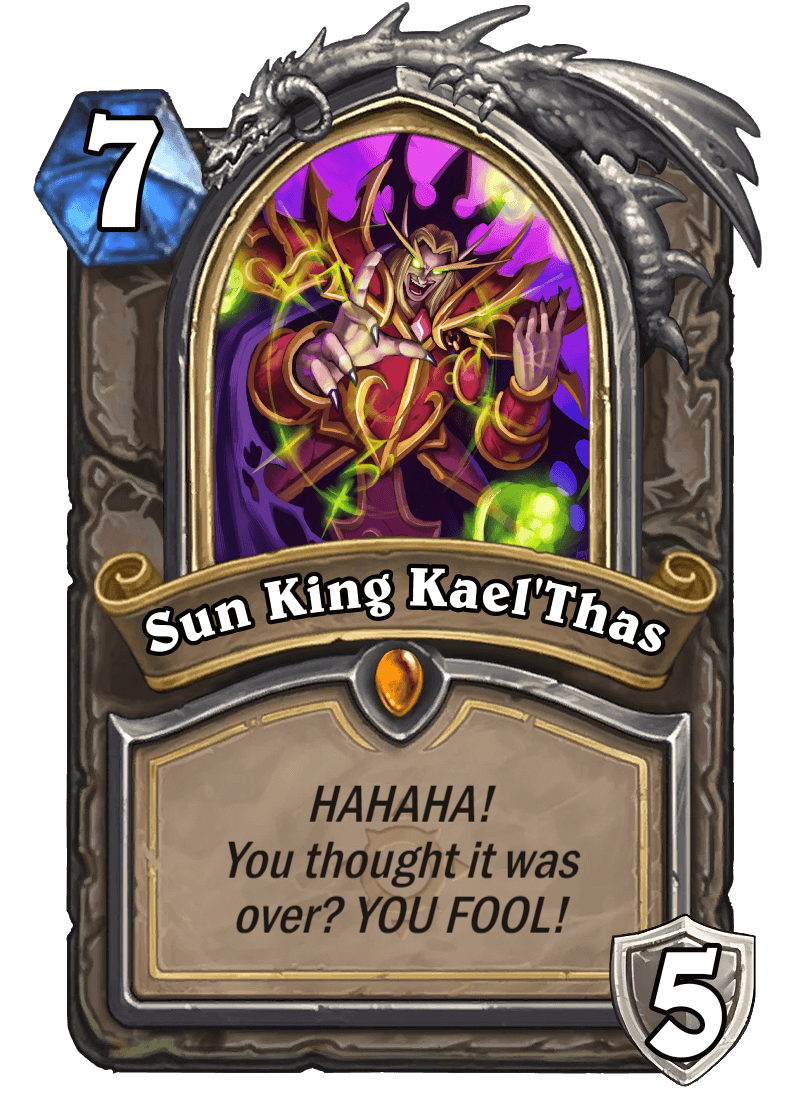 I also wanted him to be unique in a way no legendary felt before. That's when I got to the idea of 'End of Game'. We've had a plenty of 'Start of Game' effects so I wanted him to activate the moment your opponent think they are going to kill you (if you met the condition of course). From there, your hero doesn't exist and Kael'Thas takes the wheel: new Hero Power, some Armor and a chain crazy Legendary weapons. In the Lore, you actually battle Kael'Thas by having to face against his 7 Legendary Equipments. I tried to transform them into something that would feel very Hearthstony.