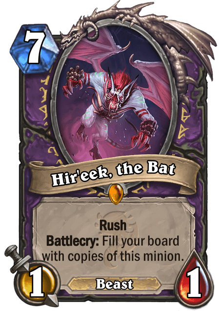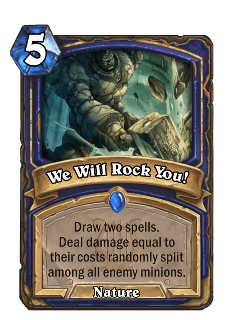 Love a lot of the buffs you gave out. Especially a fan of Hir'eek, the Bat as he is one of my favorite cards. The cards you added are quite fun too. I love Meteor Shower and We Will Rock you! is the best named card ever! With the Archmage I love the idea of turning spellpower into something else (mana, armor, minions, draw or whatever). It's a cool untapped aspect that I have no doubt Blizzard will do and this is a great idea of how to do it.