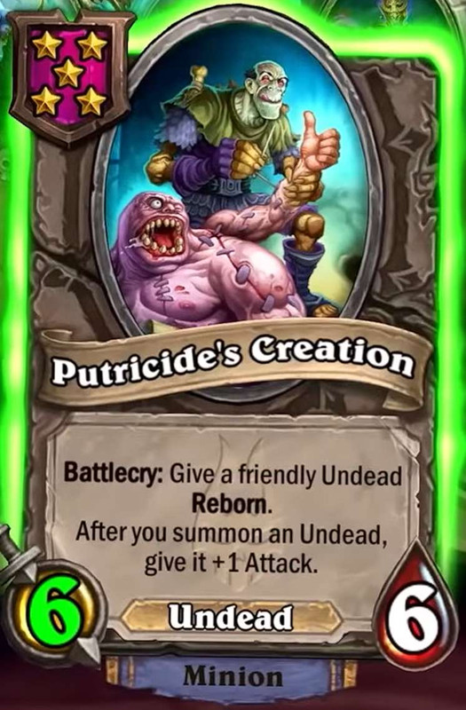 The created custom minion card "borrows" the art from the first pick, has the higher Tavern Tier of the two, and they are all referred to simply as 'Putricide's Creations'. As far as we are aware, there won't be any further tripling allowed with these! And with only 3 uses of the Hero Power available per game, it's best to choose wisely.