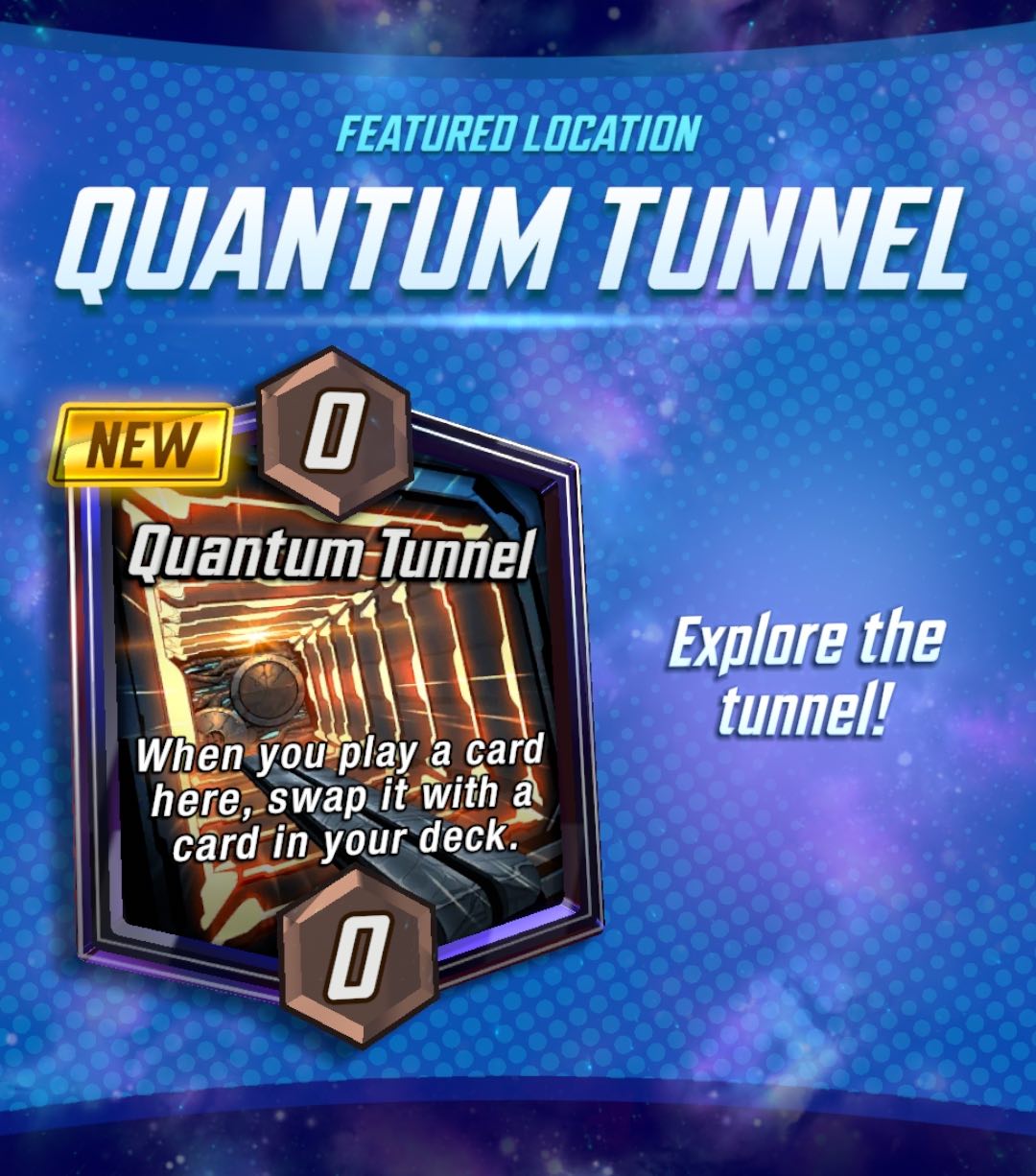 As a Featured location, Quantum Tunnel will have a 40% chance to appear for 48 hours, from 7 PM PT Tuesday night to 7 PM PT Thursday night (2 AM UTC Wednesday to 2 AM UTC Friday) - that gives us just enough time to try out these decks that want to see it more often.