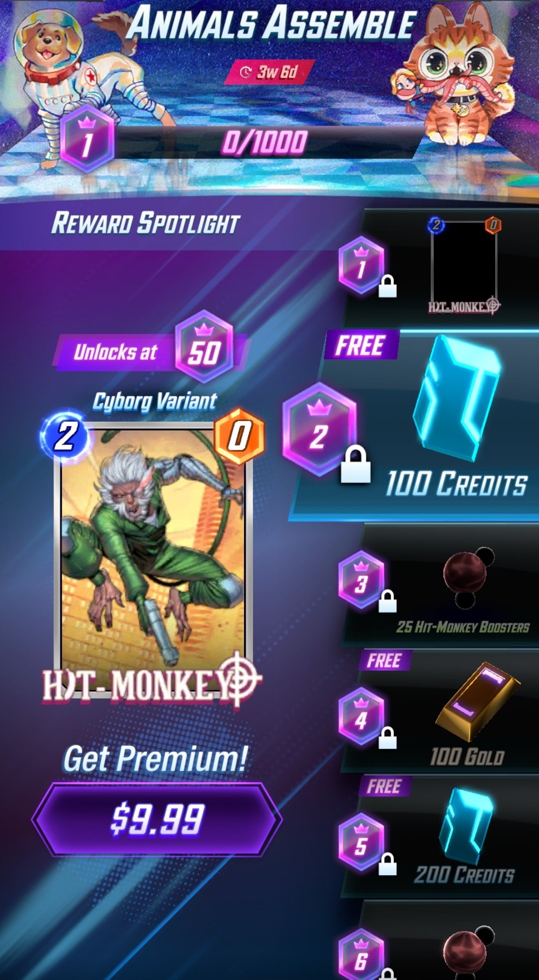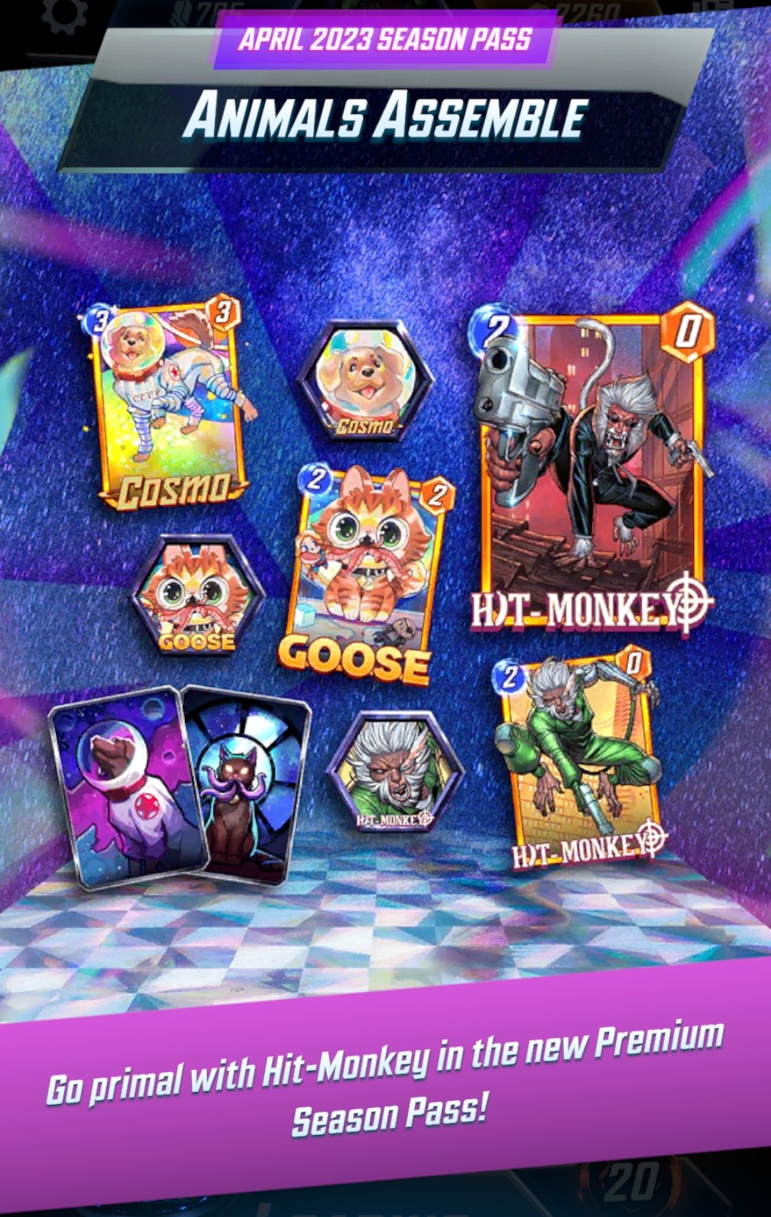 The Premium Season Pass contains all that plus 300 Credits, 110 Hit Monkey Boosters, 60 Cosmo Boosters, 60 Goose Boosters, 900 Gold, and four Mystery Variants. It also has the Hit Monkey base card and exclusive cosmetics that will not return in the future: Variants for Hit Monkey, Cosmo, and Goose, Avatars using the art of those Variants; two Titles; and a card back.