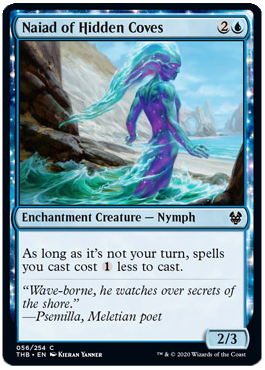 Naiad of the Hidden Coves is another card that wants you to be playing cards on your opponent's turn. We already saw a couple of creatures like that here. The main problem I had with all of them is that they didn't have flash. There is already a 'flash' deck that only wants to play cards on your opponent's turn, and I have played that deck enough to know that you never ever want to tap all of your lands on your turn. So if you are playing a sorcery-speed creature then it has to be powerful. I am not sure if perhaps this deck can be shifted to a more control-type deck to fit these cards in, but in the current configuration of the deck I don't think these cards are worth it. But there is certainly potential in these cards.